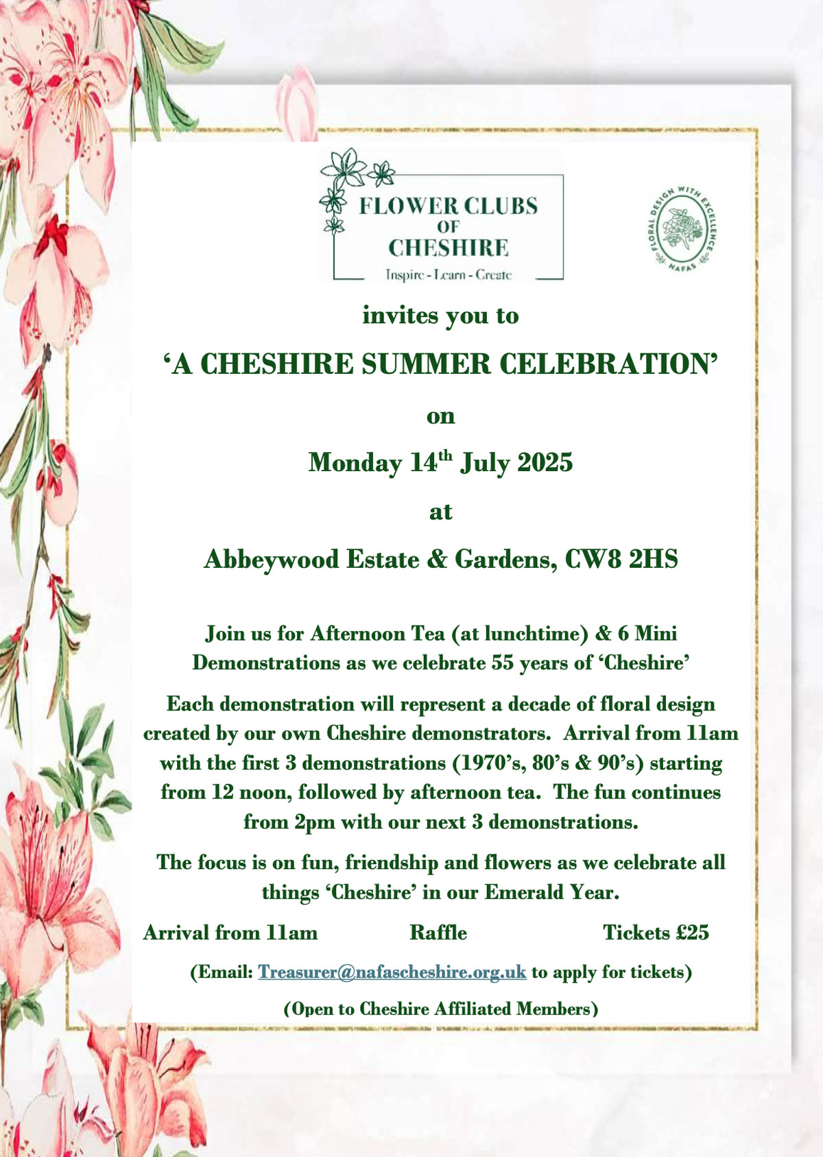 Welcome to the Midsummer issue of our Members Newsletter. It has been a very busy few weeks across the Flower Clubs of Cheshire.