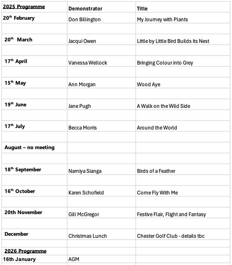 Following our AGM on 18th January we are pleased to announce that our new President is Dawn Weaver, who in addition to being our most recent past Chair is a NAFAS National Demonstrator. We are thrilled that Dawn is continuing to support the club in addition to her busy schedule of demonstrations and teaching. The new Chair for 2024 is Janet Edwards who is supported by an enthusiastic committee who extend a warm welcome to existing and new members.
