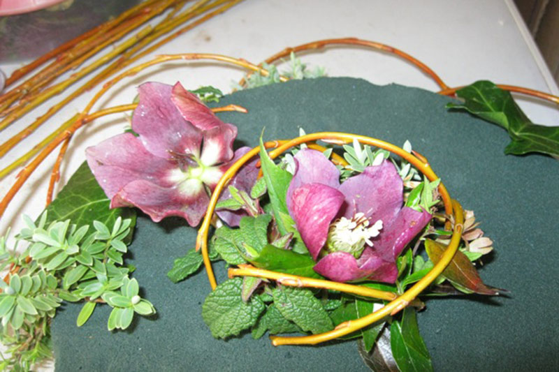 Pick a selection of foliage from the garden with good contrasting foliage ie. Buxus, Hebe, Hedera, Heuchera. * Purchase a stem of mini cymbidium orchid. * Other spring flowers from the garden can be used if available i.e. Helebore-choose ones with their seed heads. * Muscari, small tulips, hyaciths or similar can be used. * Condition in water for at least 2 hours. * Choose some flexible bear stems of willow, rubus, Flexigrass or midilino sticks.