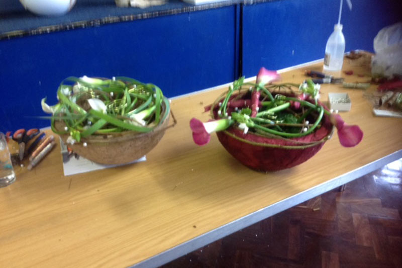 Gently bend and manipulate the flowers and other stems around the bowl with the cut ends placed into the floral foam and secure with a pearl headed pin through the stem.